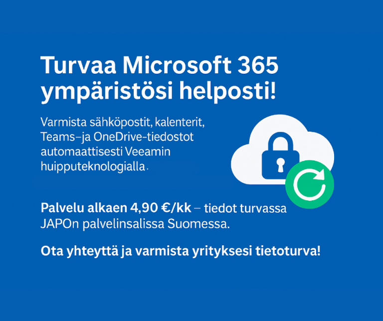 Microsoft 365 varmistus on yksi tärkeimmistä tietoturvaratkaisuista nykypäivän yrityksille. Vaikka Microsoft 365 tarjoaa vakaan ja monipuolisen ympäristön, se ei ole täydellinen suoja tietojen katoamista vastaan. Yrityksen tietoturva voi vaarantua hetkessä inhimillisen virheen, teknisen vian tai kyberhyökkäyksen seurauksena. Siksi varautuminen on kriittistä – JAPO auttaa mielellään!